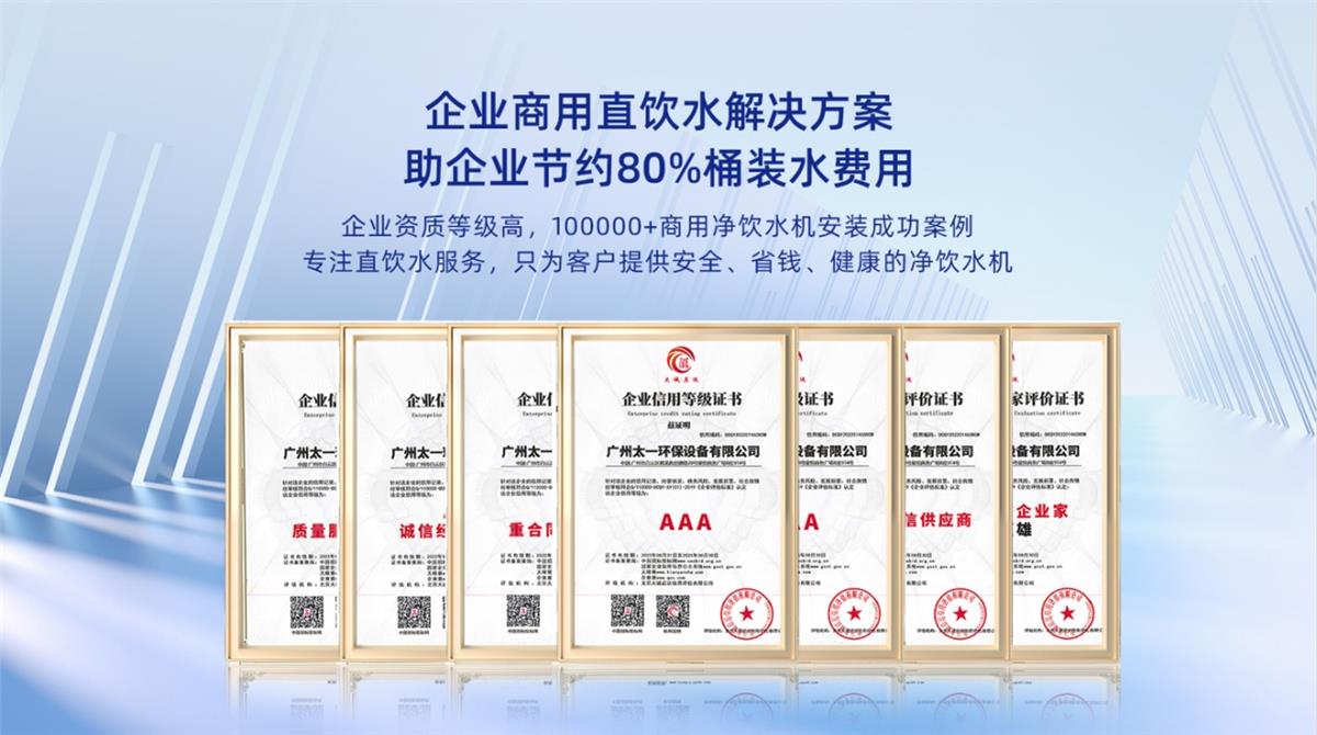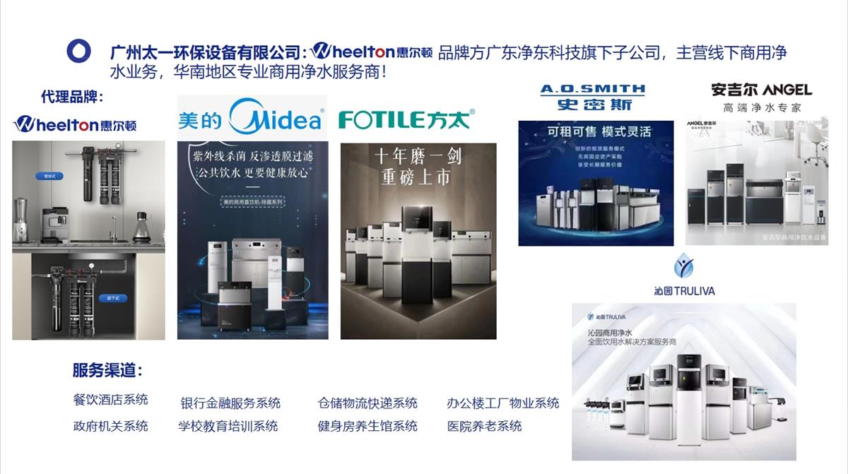 广州太一环保设备有限公司,专注企事业单位直饮水、餐饮连锁净饮水业务;代理国内外主要知名净饮水品牌:AO史密斯,美的,沁园,惠尔顿,方太等;在全国主要城市建立专业的设计安装售后服务网络;为广大用桶装水企事业单位、餐饮连锁提供一站式净饮水综合解决方案。